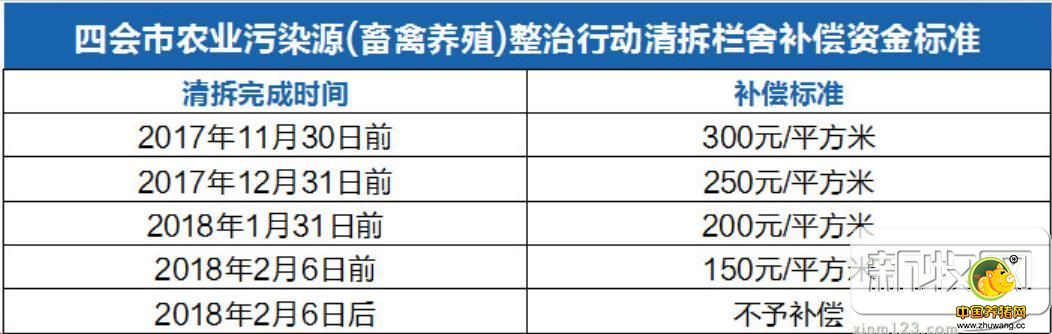 《暂行办法》提到,补偿资金的范围和对象是指在四会市辖区内全域范围,按规定的时限内主动清理拆除养殖栏舍的养殖场(户)。《暂行办法》提到,为使所有养殖场(户)主动清拆养殖栏舍,以被清拆的养殖栏舍占地面积为依据,按完成清拆的时段和不同的标准,对养殖场(户)给予补偿(包括栏舍、机具清拆搬迁及畜禽搬迁等费用)。具体完成清拆时段和补偿标准见表格。