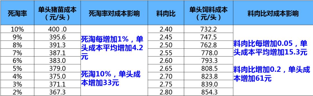 从以上数据可以明显看出,料肉比对猪场成本的影响要比死淘率大不少,当料肉比低0.2时,一头猪可多赚60多元。所以说,只看饲料价格,而忽略料肉比、价肉比,这并不是明智的做法。