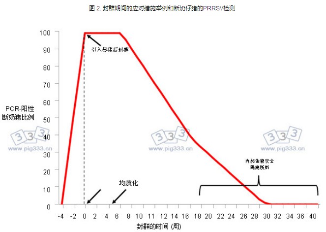 在对猪群进行蓝耳病病毒同群感染几周之后,断奶仔猪的PCR检测阳性比率会开始下降(图2)。在封群后的某个时间点,通常是16周之后,新生仔猪将无病毒血症,但在哺乳期间偶尔会发生感染。因此,严格执行内部生物安全,最大限度地降低产房内的感染并对断奶仔猪进行有效的隔离,这些措施将对从猪群中彻底清除蓝耳病病毒至关重要。最近明尼苏达大学的一份研究报告表明:猪群封群后,通常需要经过30周左右(12~43周)才能稳定地生产出PCR呈阴性的断奶仔猪。作者同时发现:感染病毒的方法及之前猪群的感染状态都会显著地影响猪群达到稳定所需的时间。区分“ 猪群封闭herd closure”与“封闭的猪群closed herd”这2个概念是非常重要的。一个封闭的猪群不从其他猪场引入新猪,但仍将内部的断奶仔猪培育成后备母猪。采用从断奶至上市与连续性生产模式的猪群从外部引入新的传染性病原的风险常较低,但那些已经存在病原在猪群内反复循环的风险较高。