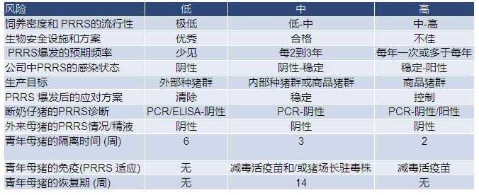 若猪场所在的区域猪只养殖密度和/ 或蓝耳病流行率较低且生物安全措施完备,建议对蓝耳病病毒进行清除。若疾病传入的概率很低且生产目标是生产阴性猪,那么通过利用一套综合的疾病监测措施, 后备母猪可以保持阴性。另一方面,因为阴性猪群蓝耳病暴发所造成的危害通常显著高于先前感染过的猪群,故对于有中度至高度蓝耳病感染风险的猪群强烈建议对后备母猪进行免疫。虽然目前对于种猪群蓝耳病免疫的完全交叉保护的效果尚有争议,也很难预测下一次影响猪群的蓝耳病病毒株型号,但最近的研究表明:先前的免疫不仅可以降低猪群从发病到稳定所需要的时间,而且也可降低猪群生产水平恢复到发病前所需要的时间,将疾病暴发所造成的生产损失最小化 。