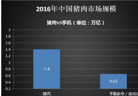 首先,我们看到2016年中国猪肉市场规模和手机市场规模的对比: