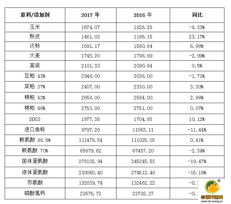 图5 2017主要饲用原料及添加剂年度均价(主产区出库均价) 单位:元/吨