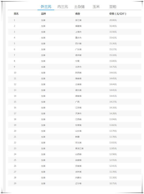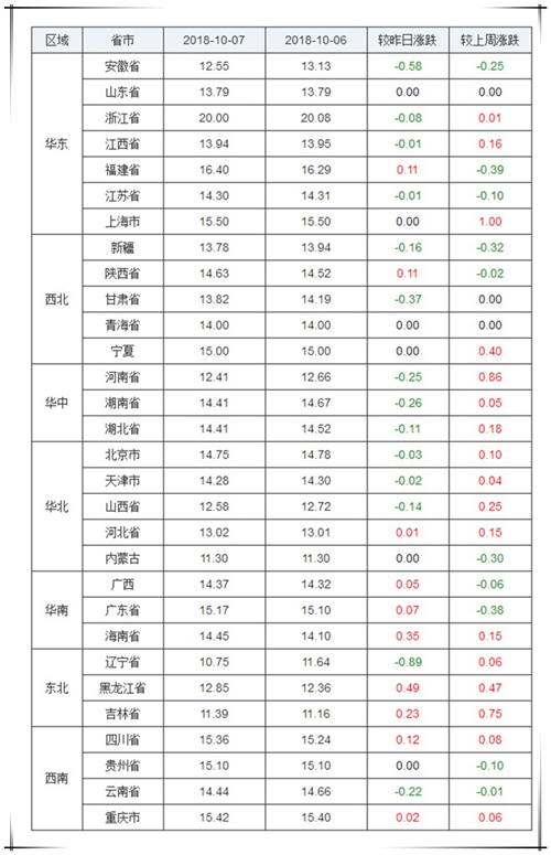 2018年10月7日,据中国养猪网猪价系统监测全国外三元均价为14.13元/公斤,报价平稳,较上周上涨0.8元/公斤,涨幅维持在0.01-0.49元/公斤,跌幅维持在0.01-0.89元/公斤。整体来看,下跌省市较多,上涨地区较少,福建、陕西、河北、广东、广西、海南、黑龙江、吉林、四川、重庆等省市上涨,其余省市下跌或持平。