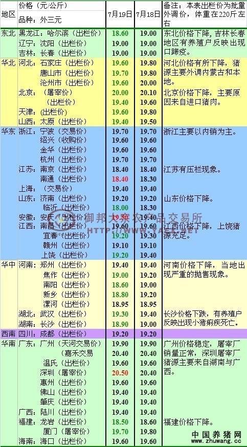 昨日湖南生猪出栏均价19.02元/公斤,与前日相比上涨0.06元/公斤。其中长沙、湘潭、株洲、郴州等地生猪出栏价18.90-19.40元/公斤,岳阳、益阳、常德、邵阳、娄底等地生猪出栏价18.60-19.10元/公斤,衡阳、永州等地生猪出栏价19.00-19.30元/公斤,7月19日全国生猪出栏均价19.21元/公斤,与前日相比下跌0.08元/公斤,全国猪粮比8.28:1。其他地区生猪价格请见下表。