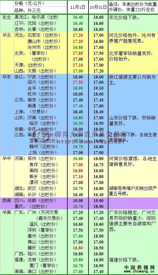 昨日湖南生猪出栏均价16.69元/公斤,与昨日相比持平。其中长沙、湘潭、株洲、郴州等地生猪出栏价16.40-16.80元/公斤,岳阳、益阳、常德、邵阳、娄底等地生猪出栏价16.30-17.00元/公斤,衡阳、永州等地生猪出栏价16.50-17.00元/公斤,10月1日全国生猪出栏均价17.10元/公斤,全国猪粮比7.15:1。其他地区生猪价格请见下表。